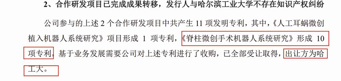 而招股書披露的哈工大、思哲睿相關研究的分工情況顯示——哈工大負責完成微創手術機器人設計、優化過程中必要的仿真、計算和分析,進行微創手術機器人精度等必要技術指標的測量,而其僅享有微創手術機器人仿真、計算和分析有關的著作權、專利申請權、專利權、商業秘密等知識產權。