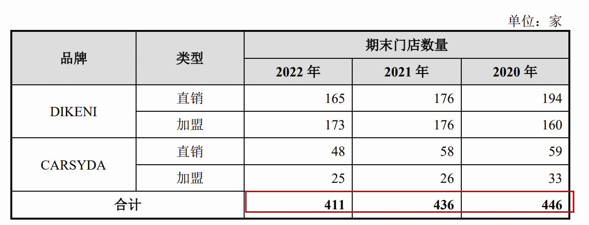 對比2022年底迪柯尼的213家直銷門店數量,從募投計劃來看,意味著迪柯尼在三年后直營門店數量可能擴充超過一倍,這樣的實體店擴張計劃卻是在過去的兩年內迪柯尼直營門店關閉了40家的背景下擬定的。