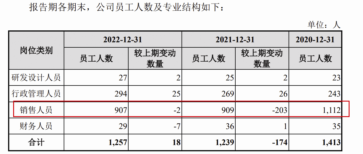 伴隨著一批直營店的關閉,迪柯尼的銷售人員也在明顯減少,2021年,公司銷售人員減少203人,2022年又減少2人(見圖三),兩年間銷售人員減少205人,減少18.44%。