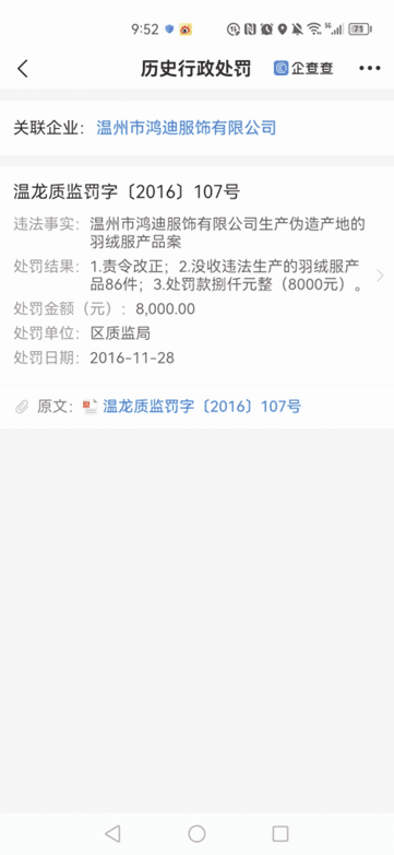 根據招股書,溫州市鴻迪服飾有限公司(以下簡稱“鴻迪服飾”)在報告期內連續三年為迪柯尼的第一大供應商,公司向其采購成衣,2020-2022年分別向其采購1662.18萬元、2490.83萬元、2228.31萬元(交易金額包括其同一控制下的浙江鴻迪服飾股份有限公司),分別占當年總采購金額的比例為10.43%、8.67%、9.65%,而企查查顯示,溫州鴻迪曾在2016年因生產偽造產地的羽絨服產品被罰款八千元,沒收違法生產的羽絨服86件(見圖四)。