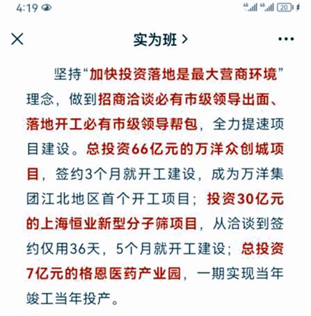 認(rèn)證主體為中共平度市委辦公室的微信公眾號(hào)“實(shí)為班”2021年12月7日發(fā)布的《@平度:工業(yè)挺起“全面突破”的硬脊梁》一文中,明確稱“投資30億元的上海恒業(yè)新型分子篩項(xiàng)目,從洽談到簽約僅用36天,5個(gè)月就開工建設(shè)。”(見圖三)