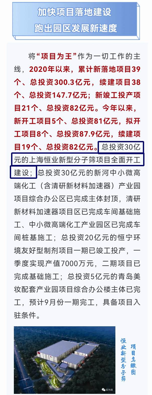 “實(shí)為班”2022年5月16日發(fā)布的《四區(qū)八園巡禮——青島新河生態(tài)化工科技產(chǎn)業(yè)基地聚力打造人產(chǎn)城融合發(fā)展的現(xiàn)代化新城》一文中,又稱“總投資30億元的上海恒業(yè)新型分子篩項(xiàng)目全面開工建設(shè)。”(見圖四)