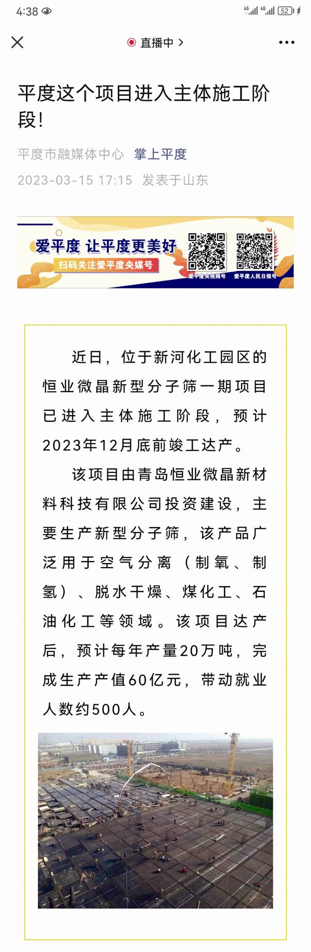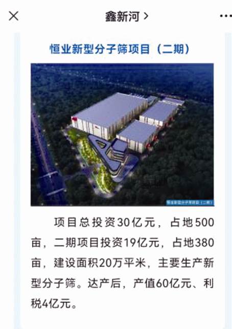 該文稱:“近日,位于新河化工園區(qū)的恒業(yè)微晶新型分子篩一期項(xiàng)目已進(jìn)入主體施工階段,預(yù)計(jì)2023年12月底前竣工達(dá)產(chǎn)。該項(xiàng)目由青島恒業(yè)微晶新材料科技有限公司投資建設(shè),主要生產(chǎn)新型分子篩,該產(chǎn)品廣泛用于空氣分離(制氧、制氫)、脫水干燥、煤化工、石油化工等領(lǐng)域。該項(xiàng)目達(dá)產(chǎn)后,預(yù)計(jì)每年產(chǎn)量20萬噸,完成生產(chǎn)產(chǎn)值60億元,帶動(dòng)就業(yè)人數(shù)約500人。”并且,該文配有一張工程施工實(shí)景圖片。