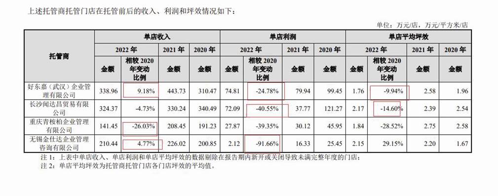 迪柯尼的解釋是:單店利潤方面,上述托管商2022年的單店利潤較2020年皆有所下降,主要系托管后支出的托管費占收入比例大于托管前員工薪酬占收入的比例。