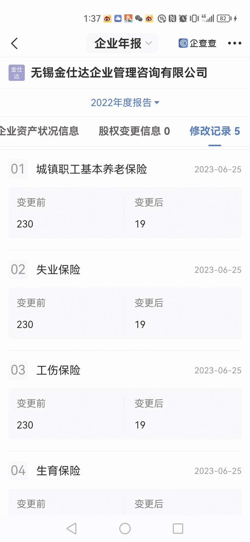 另外,企查查數據顯示,好東嘉、重慶青桉柏2022年年報顯示,上述兩家企業2022年員工社保繳納為零(見圖五)。而無錫金仕達在2023年6月25日變更了2022年社保繳納數據,2022年繳納人數由230人變列為19人(見圖六)。