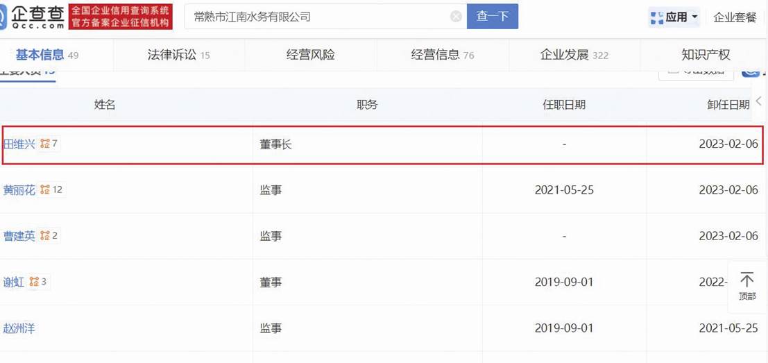 此外,中法水務現任監事會主席田維興此前還曾擔任常熟江南水務董事長,直到2023年2月才卸任(見圖五);目前兼任保障房公司董事長、總經理。據招股書披露,“田維興,監事會主席,男,1977年9月出生,中國國籍,無境外永久居留權,本科學歷,工程師。2002年參加工作,2002年至2004年任中鐵五局集團第三工程有限責任公司經營部科員,2004年至2009年任常熟市市政建設工程監理咨詢有限公司工程監理,2009年至2013年歷任常熟市房屋征收管理辦公室科員、副科長、科長,2013年至今歷任保障房公司科長、總經理助理、副總經理、總經理、董事長,2018年至今歷任城投公司副總經理、總經理、董事長,2020年3月至2022年10月任恒信智地董事長。2022年10月起至今任國投公司董事長、總經理。2015年起至2019年7月任公司董事,2019年8月起至今任公司監事會主席。”