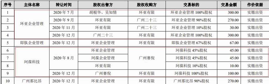 環(huán)亞科技在招股書中聲稱,于惠敏不愿經(jīng)營(yíng)之后,為優(yōu)化股權(quán)結(jié)構(gòu),環(huán)亞有限將其持有的珂葆科技10%股權(quán)、環(huán)亞企業(yè)管理將其持有的珂葆科技45%股權(quán)、珂葆企業(yè)管理將其持有的珂葆科技45%股權(quán)合計(jì)以實(shí)繳出資100萬元為作價(jià)轉(zhuǎn)讓于廣州賽倪。股權(quán)轉(zhuǎn)讓完成后,珂葆科技的股權(quán)結(jié)構(gòu)為廣州賽倪持有其100%股權(quán),而廣州賽倪為環(huán)亞科技實(shí)控人所控制的企業(yè)。