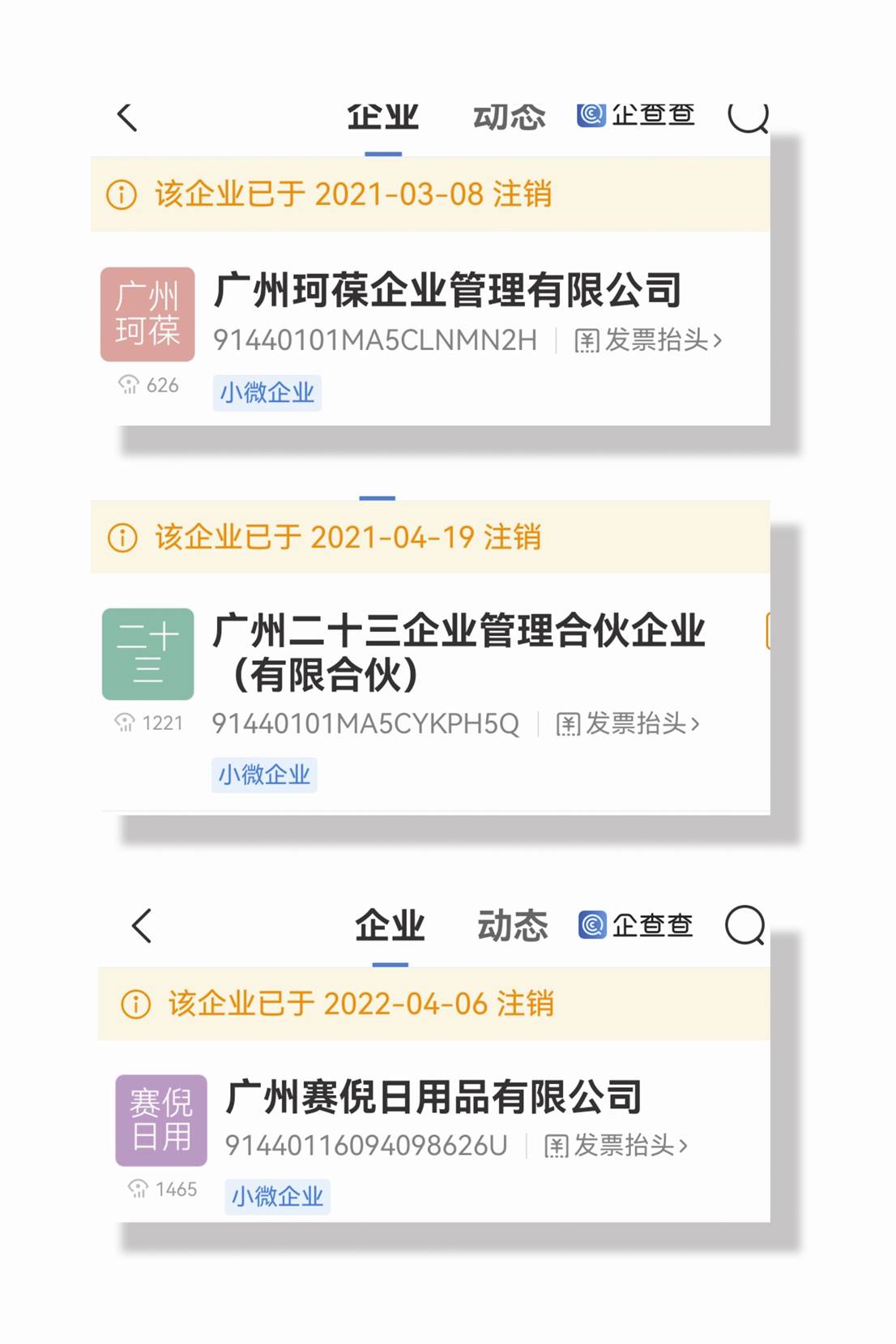 有意思的是,企查查查詢的工商信息顯示,上述股權(quán)轉(zhuǎn)手完成后,2021年3月、2021年4月和2022年4月,珂葆企業(yè)管理、廣州二十三、廣州賽倪分別完成了企業(yè)注銷(見圖二)。