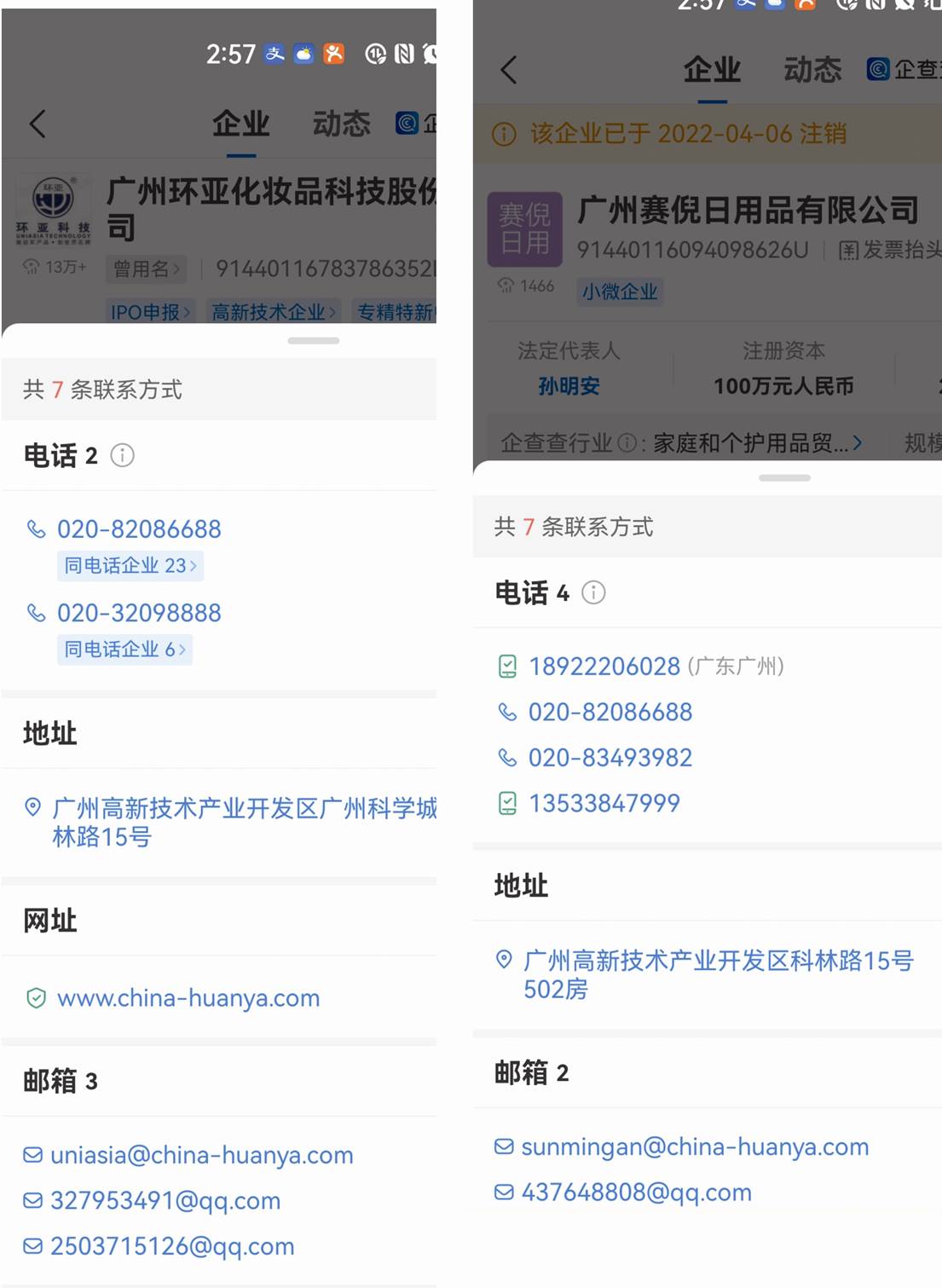 需要指出的是,企查查顯示,環(huán)亞科技和廣州賽倪使用了相同辦公電話020-82086688,廣州賽倪電子郵箱sunmingan@cina-huanya.com的后綴與也環(huán)亞科技相同, 注冊(cè)地點(diǎn)也與環(huán)亞科技一致(見圖四)。