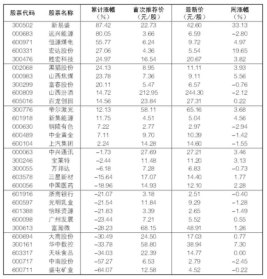30成份股本周漲幅前五位的是新易盛、宏達股份、華中數(shù)控、山西焦煤、恒源煤電,漲幅分別為33.13%、19.65%、7.30%、5.56%、4.97%;跌幅方面,銅陵有色、遠興能源、中南股份、山西汾酒、上汽集團跌幅居前。