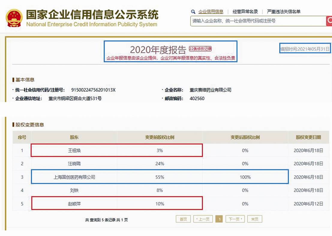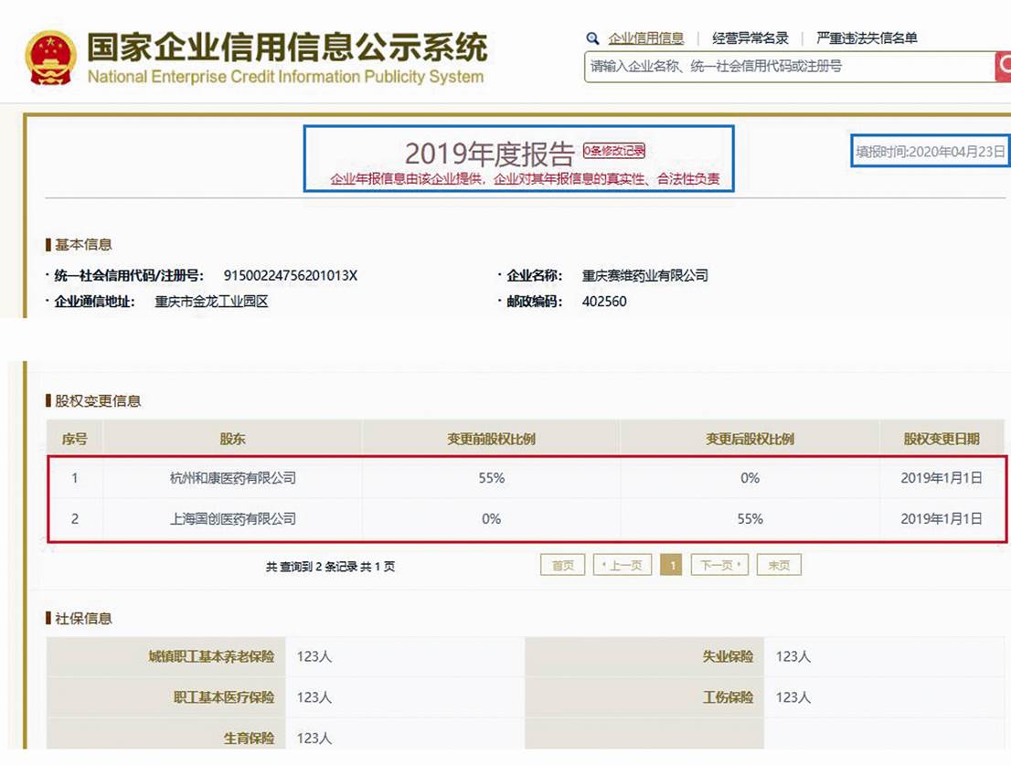 通過國家企業信用信息公示系統查詢到的重慶賽維2019年企業年報(2020年4月23日填報)同樣顯示,股權變更信息中,杭州和康出讓55%股權,國創醫藥受讓55%股權(見圖二)。根據我國相關規定,企業向當地市場監督機構每年都應提交企業年報,并對填報內容真實性、合法性負責。