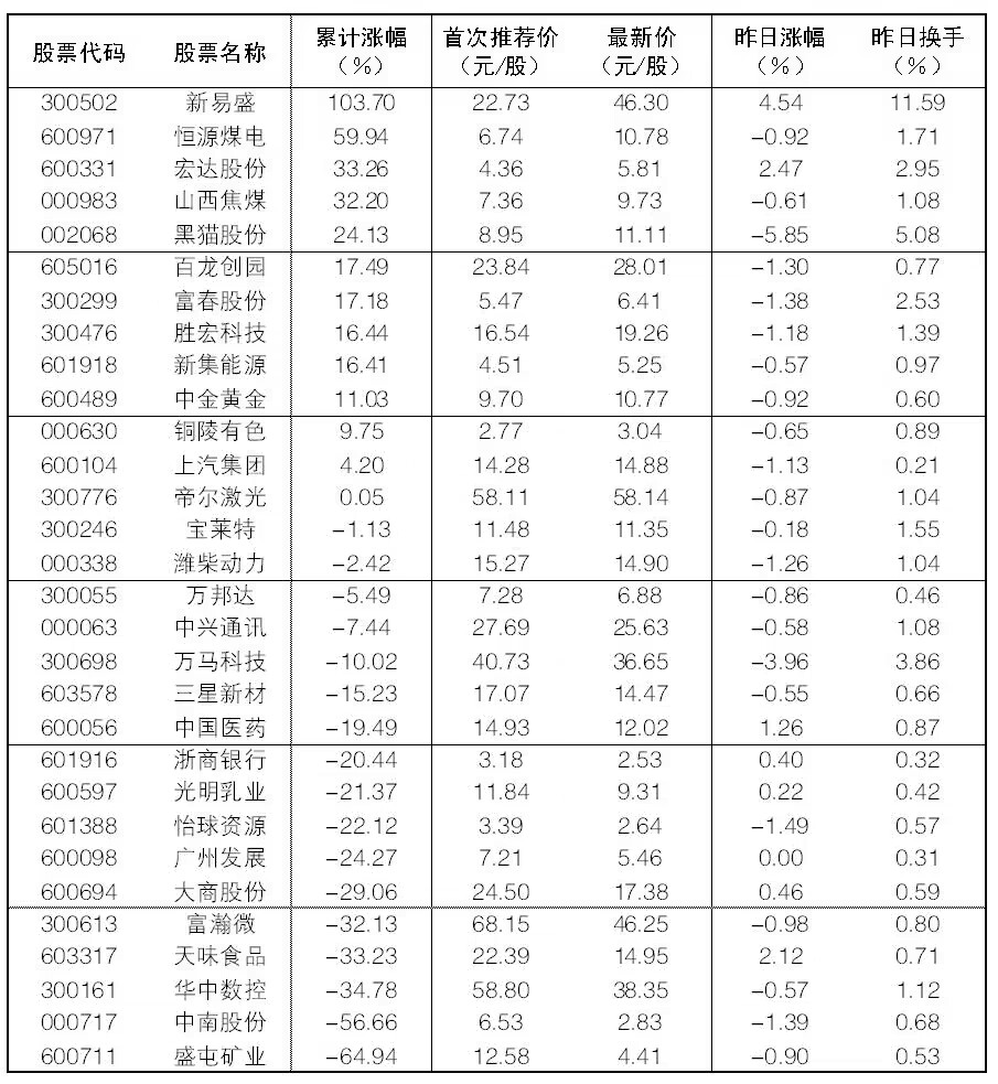 30成份股30日漲幅前五位的是新易盛、宏達股份、天味食品、中國醫藥、大商股份,漲幅分別為4.54%、2.47%、2.12%、1.26%、0.46%;跌幅方面,黑貓股份、萬馬科技、怡球資源、中南股份跌幅居前。
