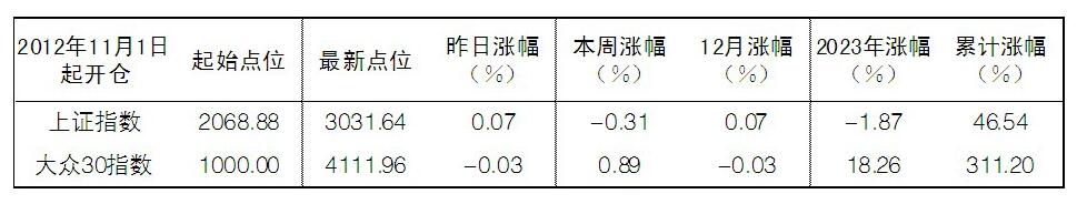 本報訊(記者 湯曉飛)本周,大盤呈現探底后逐步企穩的走勢,上證綜指下跌0.31%,深證成指下跌1.21%,大眾30指數上漲0.89%。