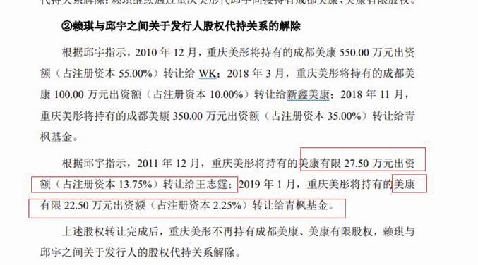 在賴琪和邱宇解除代持關系的過程中,在邱宇指示下,重慶美彤將持有的成都美康部分股權轉讓給了WK和其他受讓股東,之后賴琪又通過股權激勵以及層層股權轉讓,由代持人搖身變成公司的實控人。