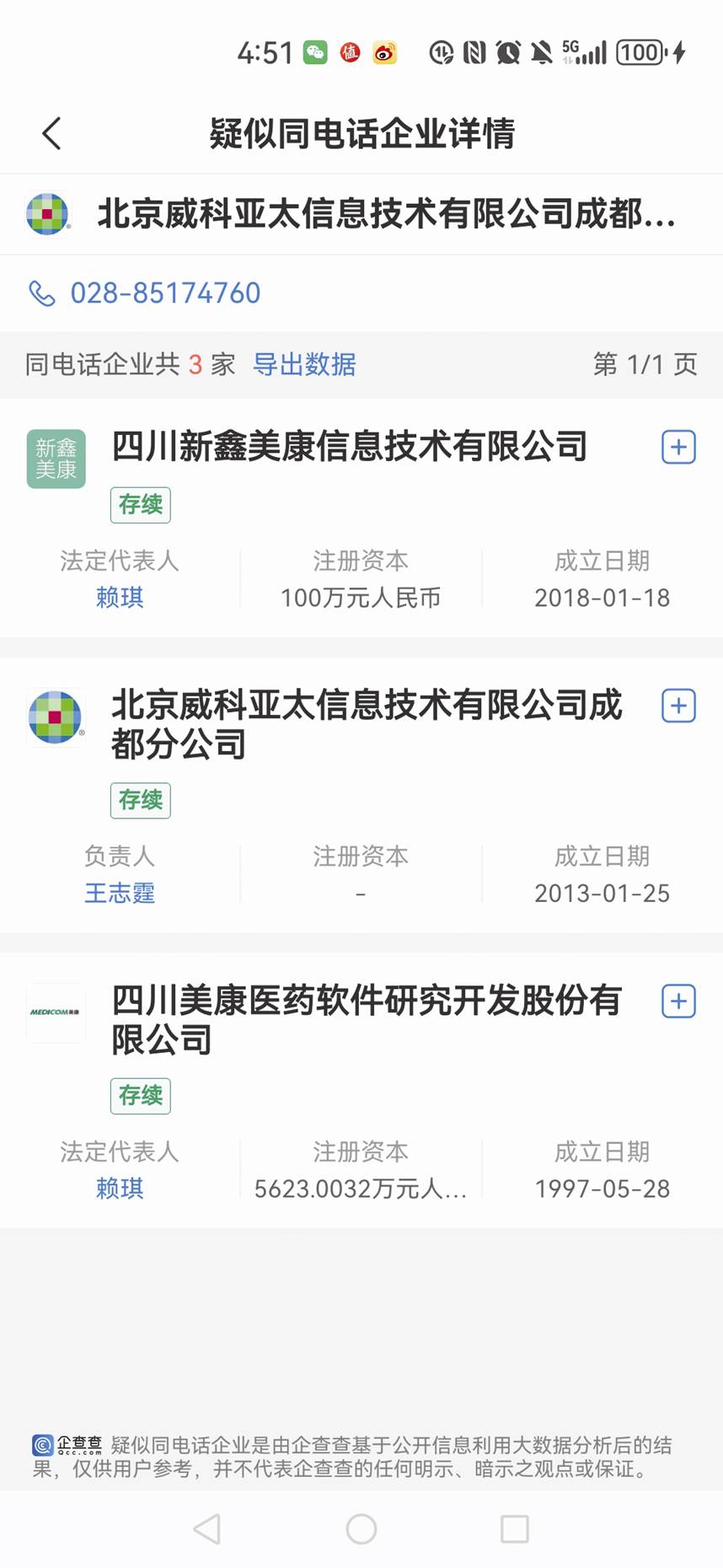 值得一提的是,WK亞太地區負責人王志霆,同時也擔任北京威科亞太信息技術有限公司成都分公司的負責人。企查查顯示,該企業和賴琪所控制的新鑫美康電話號碼相同(見圖六)。