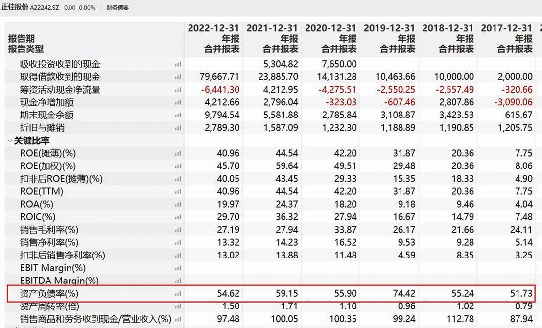 Wind數(shù)據(jù)顯示,從2018年到2022年各期末,正佳股份資產(chǎn)負(fù)債率穩(wěn)穩(wěn)地維持在54%以上,2019年12月末一度高達(dá)74%(見圖一)。