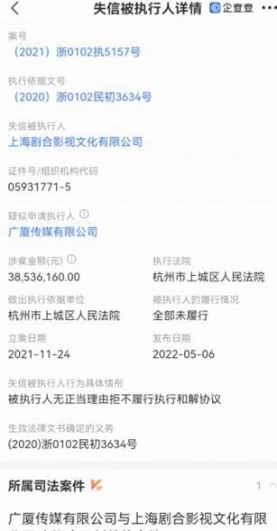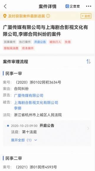 圖一:企查查關(guān)于廣廈傳媒與上海劇合案件截圖