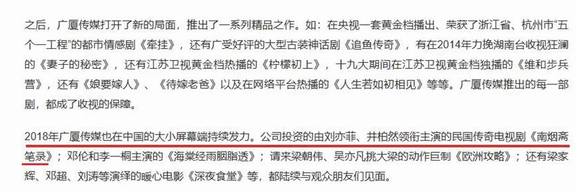 此外,有關(guān)于廣廈傳媒的報道顯示其投資了《南煙齋筆錄》(見圖四)。同時,浙江廣廈集團旗下地產(chǎn)項目廣廈綠園在2018年8月27日曾發(fā)文,稱“電視劇《南煙齋筆錄》是由廣廈集團旗下廣廈傳媒參與出品的又一IP現(xiàn)象級影視力作,預計2018年底或2019年將于熒屏與觀眾見面。”