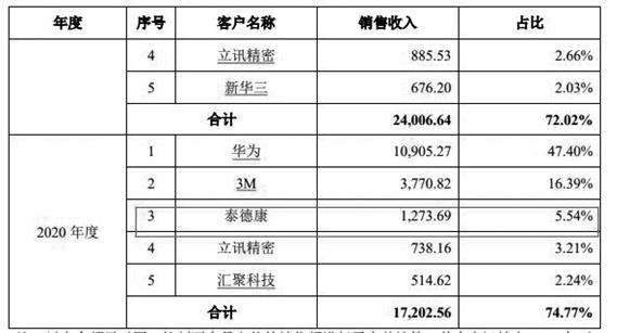 同時,泰德康還曾是盛凌電子的重要客戶。招股書顯示,直到2020年,泰德康還位列盛凌電子前五大客戶名單,當年公司向其銷售1273.69萬元,銷售占比為5.53%(見圖三)。