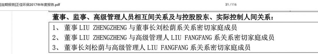 以2017年年報為例,正佳環保對于董監高相互關系及與控股股東、實控人間關系的表述為:“1、董事LIU ZHENGZHENG與董事長劉松蔭系關系密切家庭成員”“2、董事LIU ZHENGZHENG與高級管理人LIU FANGFANG系關系密切家庭成員”“3、 董事長劉松蔭與高級管理人LIU FANGFANG系關系密切家庭成員”。