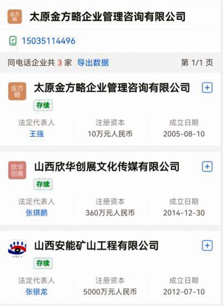 需要注意的是,太原金方略向當地市場監督機構提交的企業年報中,2013年至2020年均使用手機號碼15035114496作為企業聯系電話。此外,兩家企業也曾以該號碼作為企業聯系電話(見圖二),一家為公司關聯方山西安能礦山工程有限公司(以下簡稱“安能礦山”),凝固力實控人王建中目前持股40%,另一位實控人王二中于2022年3月4日出讓20%持股、御任監事,該企業2016年年報中聯系電話使用了該手機號碼。另一家叫山西欣華創展文化傳媒有限公司(以下簡稱“欣華創展”),2018年年報中聯系電話同樣為上述手機號碼。