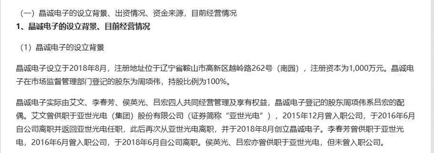 艾文曾供職于亞世光電(集團)股份有限公司(以下簡稱“亞世光電”),2015年12月曾入職東方科脈,于2016年6月自公司離職并返回亞世光電任職,此后再次從亞世光電離職,并于2018年8月創(chuàng)立晶誠電子。