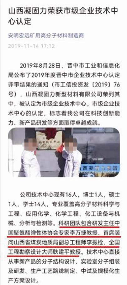 安明宏遠官微“安明宏遠礦用高分子材料制造商”2020年1月10日還發布了文章《山西安明宏遠防水材料有限公司積極參與國家關于礦用高分子材料安全技術規范的制定》,文中稱:“2019年,安明宏遠作為山西凝固力新型材料有限公司的全資子公司,設立了企業技術中心,并已經被認定為市級企業技術中心,標志著我公司在科技創新能力、新產品研發等方面已經取得了卓越成就。技術中心聘請了包括中國聚氨酯彈性體協會專家李萬捷教授、山西省煤炭地質局副總工程師李振拴、全國工程勘察設計大師耿建平教授等在內的16個行業相關的專業人才?!?見圖二)