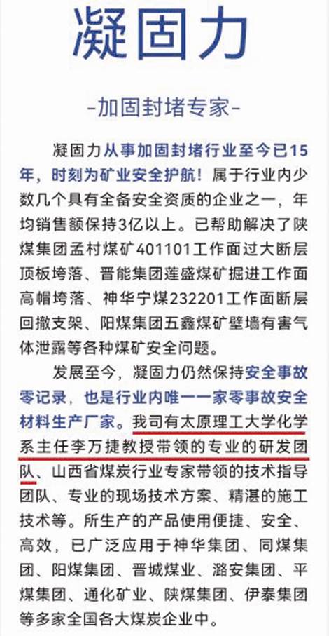 凝固力官方微信公眾號“凝固力新型材料”2020年5月11日發布的文章《凝固力-加固封堵專家》中也稱,“我司有太原理工大學化學系主任李萬捷教授帶領的專業的研發團隊、山西省煤炭行業專家帶領的技術指導團隊”。(見圖三)