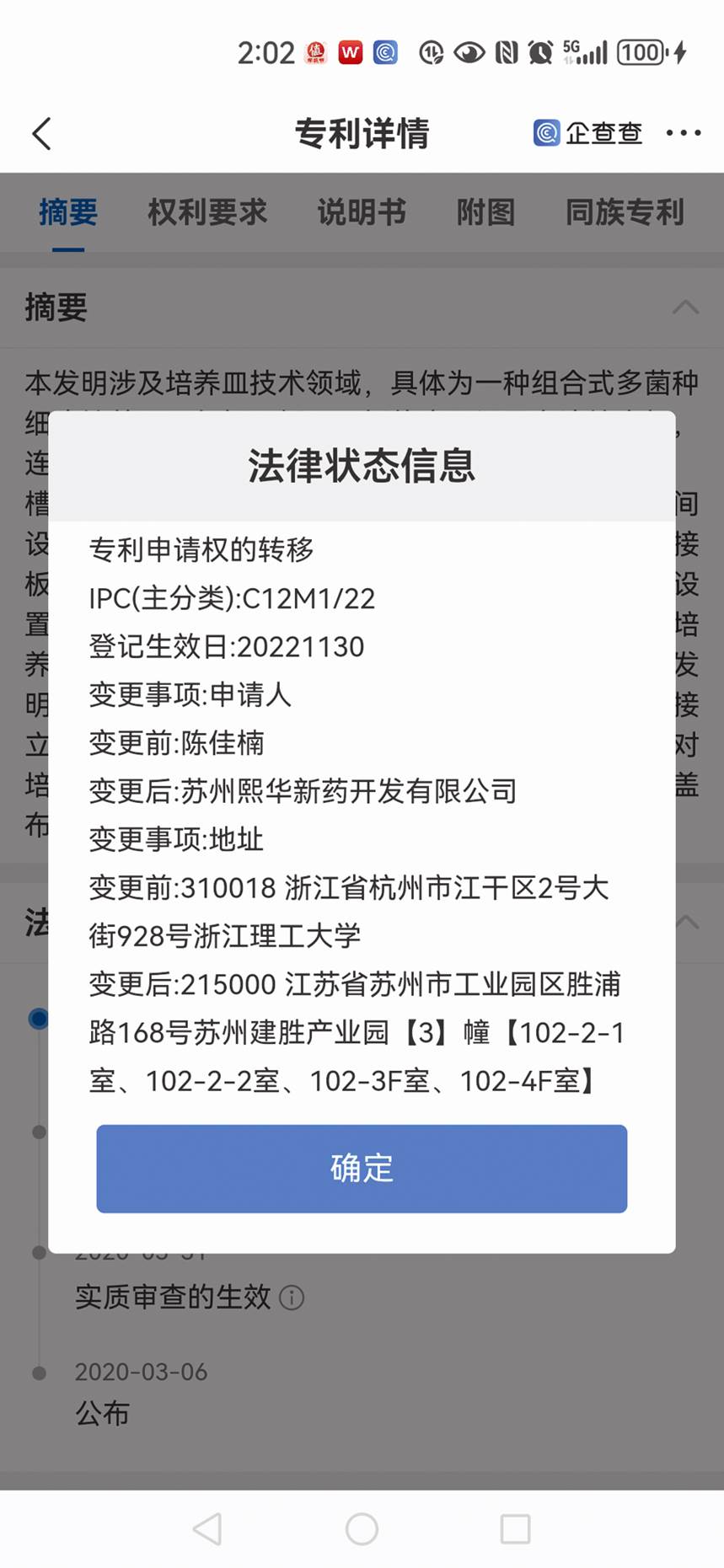 更值得一提的是,通過企查查查詢顯示,招股書所稱由蘇州熙華原始取得的發(fā)明專利—— “一種組合式多菌種細(xì)胞培養(yǎng)皿及其使用方法”的專利申請(qǐng)于2019年,當(dāng)時(shí)的申請(qǐng)人為陳佳楠,通訊地址為浙江省杭州市江干區(qū)2號(hào)大街928號(hào)浙江理工大學(xué),然而該申請(qǐng)人在專利授權(quán)日——2022年12月20日的前一周,突然在2022年12月13日完成了專利申請(qǐng)人、專利權(quán)的轉(zhuǎn)移——專利申請(qǐng)人由陳佳楠變更為蘇州熙華新藥開發(fā)有限公司,通訊地址變更為江蘇省蘇州市工業(yè)園區(qū)勝浦路168號(hào)蘇州建勝產(chǎn)業(yè)園3幢,102-2-1室、102-2-2室、102-3F室、102-4F室(見圖一)。