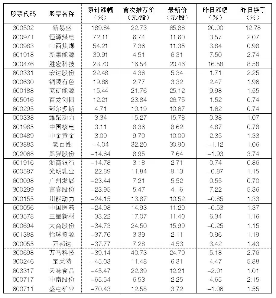 30成份股19日漲幅前五位的是新易盛、勝宏科技、兗礦能源、新集能源、富春股份,漲幅分別為20%、16.58%、9.98%、7.50%、7.22%;跌幅方面,天味食品、黑貓股份、老百姓、盛屯礦業(yè)跌幅居前。