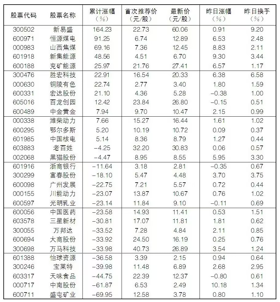 30成份股22日漲幅前五位的是中南股份、新集能源、山西焦煤、兗礦能源、恒源煤電,漲幅分別為10.18%、9.30%、8.83%、6.57%、6.53%;跌幅方面,天味食品、宏達股份、浙商銀行、百龍創園跌幅居前。