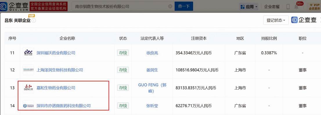 南京馴鹿生物技術股份有限公司為呂東擔任董事的企業,此外,呂東還在嘉和生物藥業有限公司、深圳市亦諾微醫藥科技有限公司擔任董事(見圖二)。結合招股書披露的銷售商品和提供勞務的關聯交易數據(見圖一)估算,上海生生與三企業年度關聯交易合計金額最高時接近500萬元。