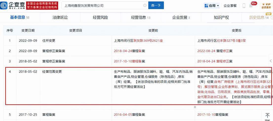 需要指出的是,上海統鑫服飾發展有限公司2018年5月2日才將企業的經營范圍增加了“自有廠房租賃(上海市閔行區紀豐路327號)”。變更前的經營范圍為“生產布制品、服裝服飾及輔料、鞋、帽、汽車內飾品,銷售自產產品,物業管理,倉儲服務(除危險品),停車(庫)經營”。(見圖二)