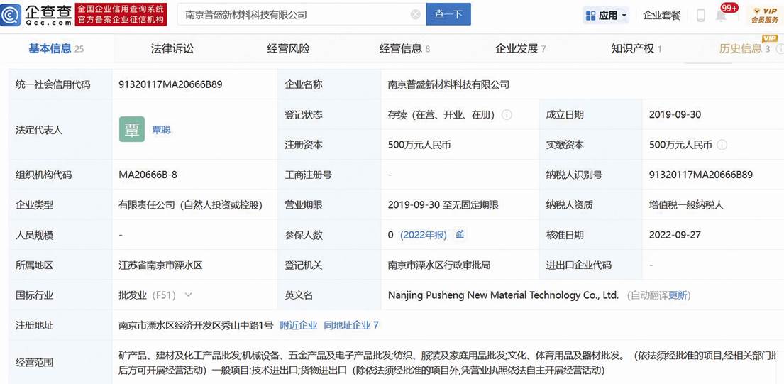 企查查顯示,南京普盛注冊資本500萬元人民幣,覃聰持股90%,法定代表人、執(zhí)行董事兼總經(jīng)理均為覃聰,經(jīng)營范圍為礦產(chǎn)品、建材及化工產(chǎn)品批發(fā);機(jī)械設(shè)備、五金產(chǎn)品及電子產(chǎn)品批發(fā);紡織、服裝及家庭用品批發(fā);文化、體育用品及器材批發(fā)。一般項目:技術(shù)進(jìn)出口;貨物進(jìn)出口。該企業(yè)2019年至2022年年報披露的參保人數(shù)一直為0人。(見圖四)