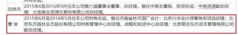 上述年報如是披露曹俊簡歷:“2015年6月至2016年5月任本公司財務總監。曾任河南省林河酒廠會計;北京興華會計師事務所項目經理;北京東方園林生態股份有限公司財務管理中心總經理、戰略和投資中心總經理;北京君合東方資本管理有限公司副總經理?!?/p>