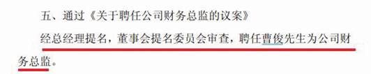 而且,彼時還簡稱*ST秦嶺的中再資環在2015年6月25日晚間,披露了董事會會議決議公告,顯示第六屆董事會第一次會議于2015年6月25日通過了《關于聘任公司財務總監的議案》,經總經理提名,董事會提名委員會審查,聘任曹俊為公司財務總監(見圖四)。