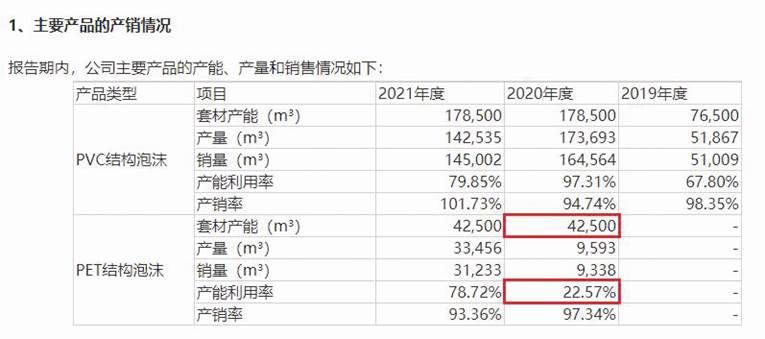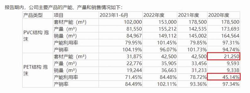 公司2022年6月首次披露的招股書中,介紹了主要產品PVC結構泡沫和PET結構泡沫在報告期內的產能、產量及產能利用率、產銷率。