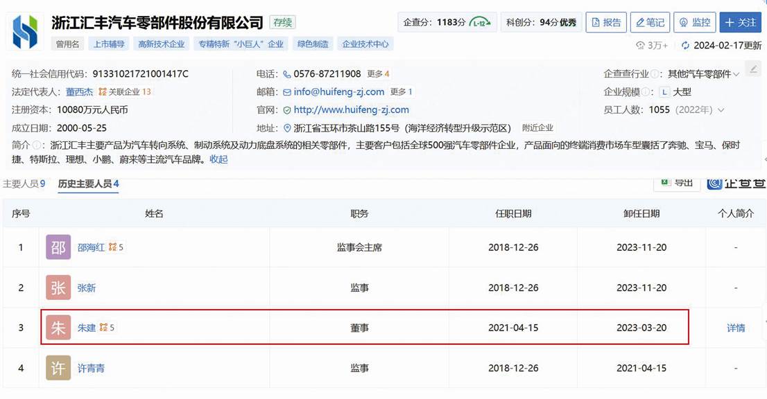 企查查顯示,浙江匯豐汽車零部件股份有限公司正處于上市輔導期,獨立董事朱建已于 2023年3月離任(見圖二)。