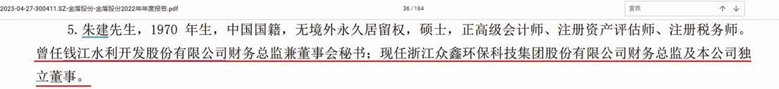 金盾股份2022年年報披露獨董朱建任職情況為:“曾任錢江水利開發股份有限公司財務總監兼董事會秘書;現任浙江眾鑫環保科技集團股份有限公司財務總監及本公司獨立董事。”(見圖四)
