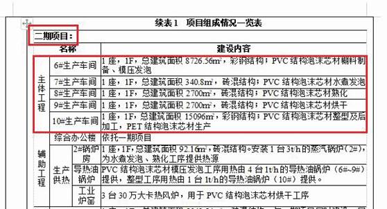 從環評報告顯示的具體施工項目看,無停車場、非機動車停車棚、綠地等非房屋建筑,而廠房為彩鋼結構或磚混結構,綜合辦公樓、庫房、鍋爐房等為磚混結構。其中,一期項目建設內容中的主體工程為1至5號共5個生產車間,均為1層建筑,合計建筑面積已接近2.96萬平方米,加上5400平米的綜合辦公樓,合計近3.5萬平方米(見圖二),已經快接近公司招股書披露的核心募投項目整個建筑面積;何況二期項目中還有6至10號等5個生產車間,同樣是1層建筑,合計建筑面積也近2.96萬平方米(見圖三)。兩期項目生產車間都用于生產PVC結構泡沫芯材或PET結構泡沫芯材。