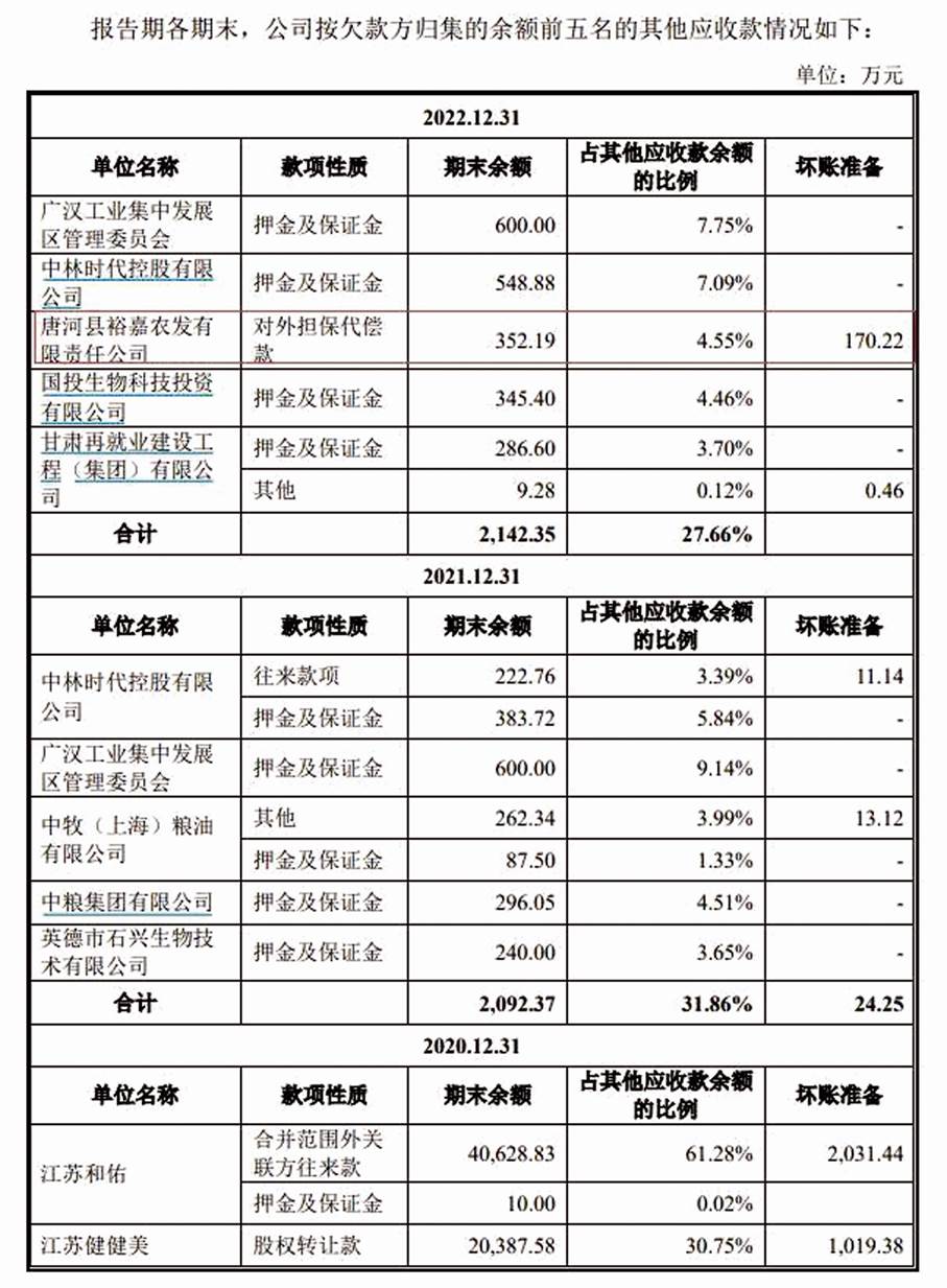 更值得注意的還有,安佑生物截至2022年12月31日的應收賬款中,有一筆對唐河縣裕嘉農發有限責任公司352.19萬元的對外擔保代償款,占當期公司其他應收款的4.55%,其中還有170萬元的壞賬準備(見圖四)。