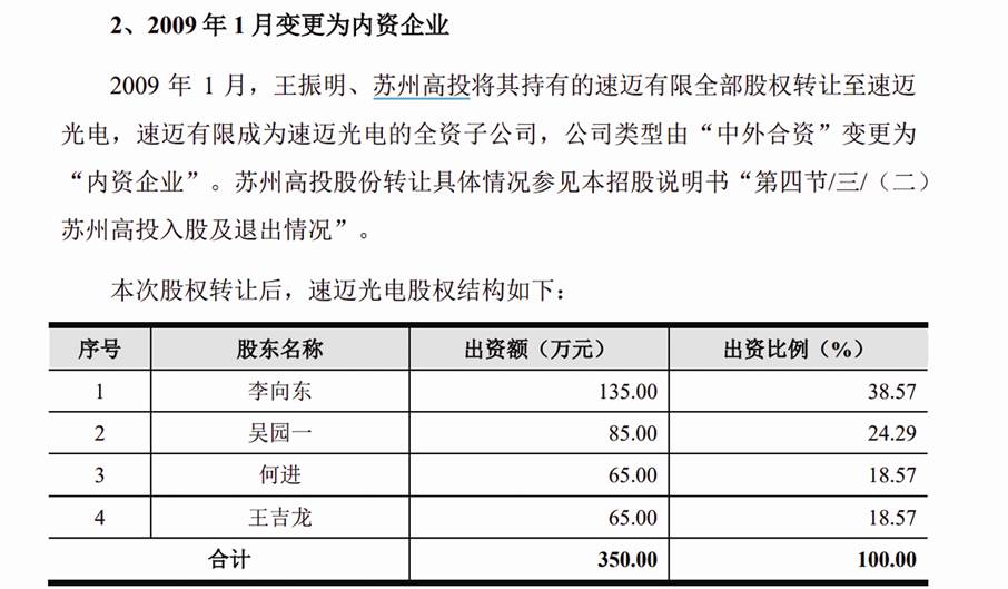 值得一提的是,招股書披露,2009年1月,王振明、蘇州高投將其持有的速邁有限(公司曾用名簡稱)全部股權轉讓至速邁光電,速邁有限成為速邁光電的全資子公司,公司類型由“中外合資”變更為“內資企業”。