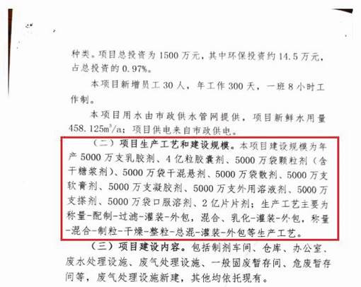 該批復文件還具體介紹了擴建規(guī)模,包括5000萬支乳膠劑、4億粒膠囊劑、5000萬袋顆粒劑(含干糖漿劑)、5000萬袋干混懸劑、5000萬袋散劑、5000萬支軟膏劑、5000萬支凝膠劑、5000萬支外用溶液劑、5000萬支搽劑、5000萬袋口服溶液劑、2億片片劑(見圖二)。