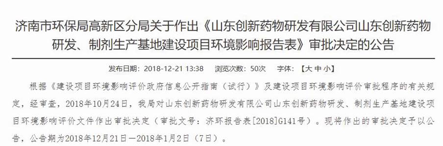 濟南政府相關(guān)網(wǎng)站2018年12月21日發(fā)布的濟南市環(huán)保局高新區(qū)分局審批公告顯示,“2018年10月24日,我局對山東創(chuàng)新藥物研發(fā)有限公司山東創(chuàng)新藥物研發(fā)、制劑生產(chǎn)基地建設項目環(huán)境影響評價文件作出審批決定(審批文號:濟環(huán)報告表[2018]G141號)”(見圖三)。