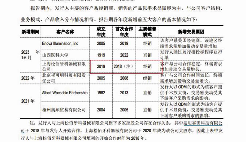 根據(jù)披露,松佰牙科成立于2019年12月19日,2020年公司向其銷售顯微鏡22臺(tái),2021年向其銷售顯微鏡36臺(tái),2022年向其銷售顯微鏡43臺(tái),2023年上半年,相關(guān)銷售數(shù)字突進(jìn)至103臺(tái)。
