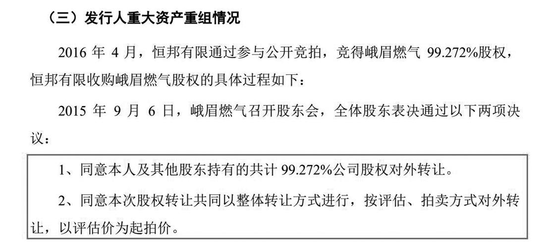 2016年1月10日,恒邦有限2016年第一次股東會決議同意公司參與峨眉燃氣股權拍賣項目,并委派代表參與拍賣及簽署本次收購的相關協議等文件。2016年1月28日,恒邦有限與四川樂山瑞星拍賣公司簽訂了《競買合同》,約定恒邦有限參加2016年2月3日由四川樂山瑞星拍賣公司組織的競拍標的為“峨眉山市燃氣有限責任公司99.272%股權(峨眉山市燃氣有限責任公司已依法取得2016年1月1日至2045年12月31日城市管道燃氣特許經營權)”的競買,起拍價為25720.00萬元。2016年2月3日,恒邦有限與四川樂山瑞星拍賣公司簽訂“樂瑞拍成字(2016)字第01號”《拍賣成交確認書》,約定恒邦有限以最高應價競得峨眉山市燃氣有限責任公司99.272%股權。