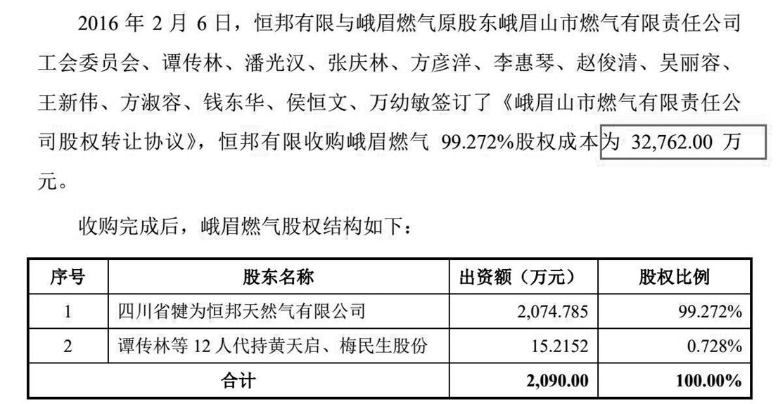 2016年2月6日,恒邦有限與峨眉燃氣原股東峨眉山市燃氣有限責任公司工會委員會、譚傳林等簽訂了《峨眉山市燃氣有限責任公司股權轉讓協議》,恒邦有限收購峨眉燃氣99.272%股權成本為32762.00萬元(見圖二)。