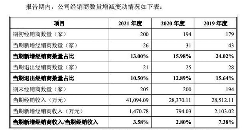 譬如,以大宗業(yè)務(wù)為主(即面向房地產(chǎn)開(kāi)發(fā)商,經(jīng)銷(xiāo)商模式在2021年、2022年的銷(xiāo)售占比為42%左右)的森鷹窗業(yè)2022年9月上市時(shí)招股書(shū)披露,2019年至2021年各期末經(jīng)銷(xiāo)商分別為194家、200家、205家,并分地區(qū)披露了2019年至2021年各期末的經(jīng)銷(xiāo)商數(shù)量。