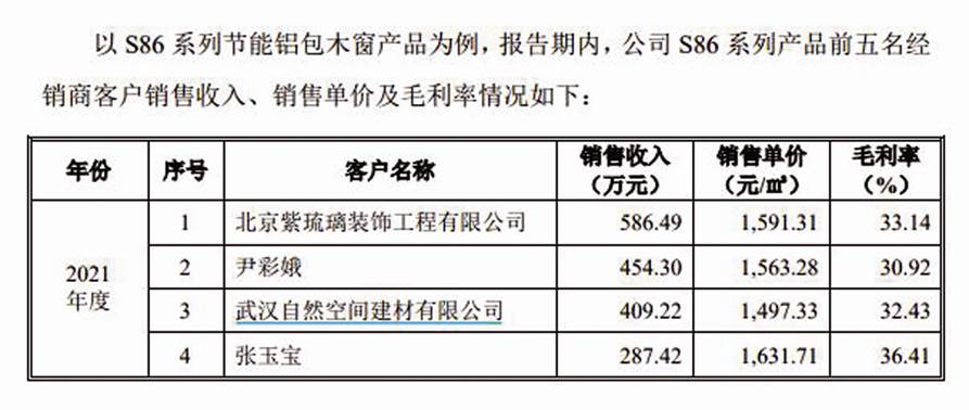 森鷹窗業(yè)在某一主要產(chǎn)品報(bào)告期內(nèi),通過(guò)大宗業(yè)務(wù)模式和經(jīng)銷(xiāo)商模式,對(duì)各自前五大客戶(hù)的銷(xiāo)售收入、銷(xiāo)售單價(jià)和毛利率進(jìn)行了對(duì)比披露和說(shuō)明。譬如,2021年大宗業(yè)務(wù)模式的第一大客戶(hù)銷(xiāo)售收入為3849.61萬(wàn)元,銷(xiāo)售單價(jià)為1459.82元/平方米,毛利率為36.52%,毛利率處于較高水平的主要原因系該項(xiàng)目窗戶(hù)開(kāi)啟比例相對(duì)較低,且窗型簡(jiǎn)單,生產(chǎn)成本相對(duì)較低所致。同年,經(jīng)銷(xiāo)商模式第一大客戶(hù)銷(xiāo)售收入為586.49萬(wàn)元,銷(xiāo)售單價(jià)為1591.31元/平方米,毛利率為33.14%,其稱(chēng)由于終端客戶(hù)選擇的產(chǎn)品配置千差萬(wàn)別,向不同經(jīng)銷(xiāo)商客戶(hù)銷(xiāo)售該系列產(chǎn)品的平均單價(jià)和毛利率也呈現(xiàn)出一定差異(見(jiàn)圖二)。