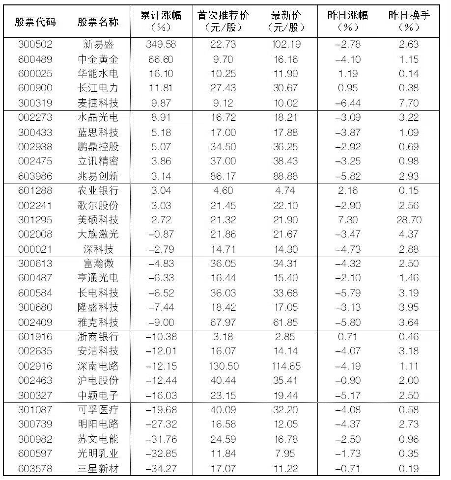 30成份股23日漲幅前五位的是美碩科技、農(nóng)業(yè)銀行、華能水電、長江電力、浙商銀行,漲幅分別為7.30%、2.16%、1.19%、0.95%、0.71%;跌幅方面,麥捷科技、兆易創(chuàng)新、雅克科技跌幅居前。